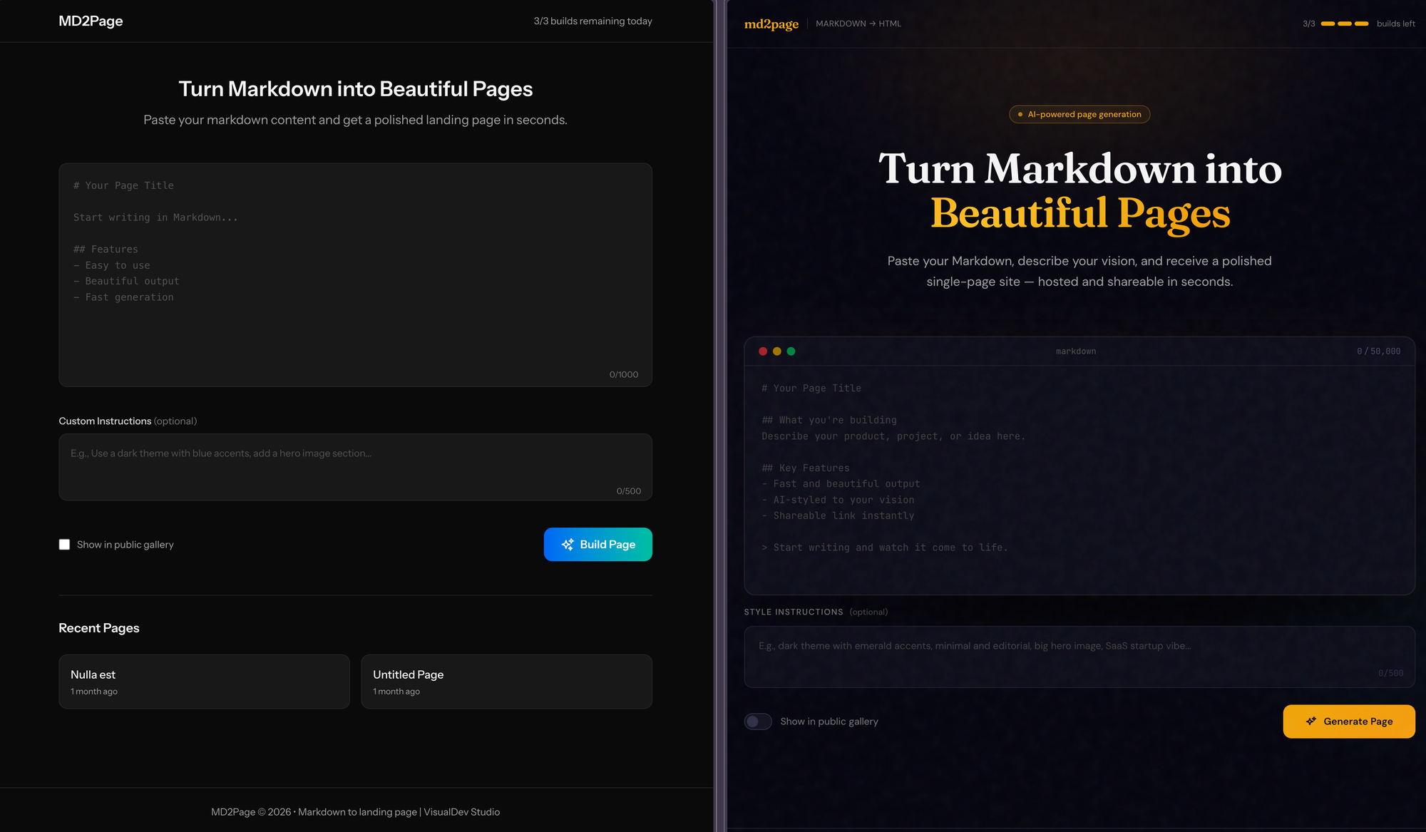 MD2Page got a refresh as well. Surprisingly, this time, AI actually nailed the landing page. Didn’t need much tweaking, which rarely happens.