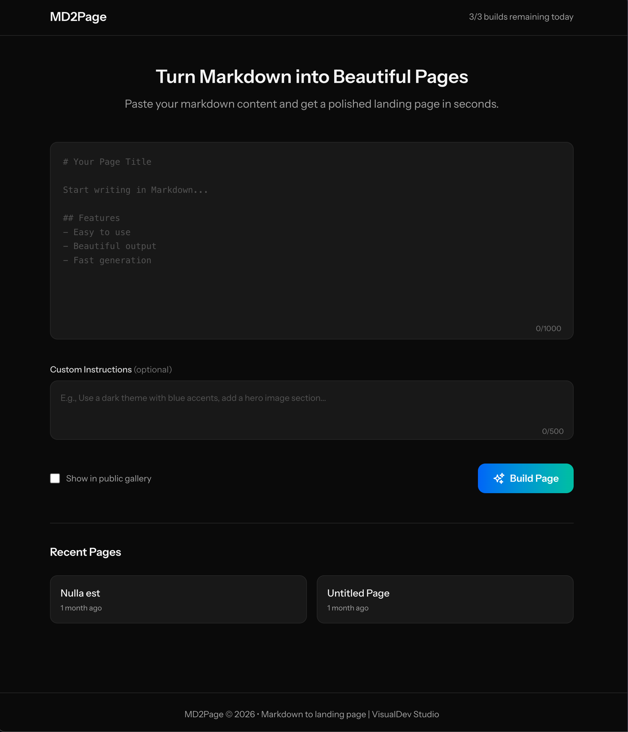 I’ve had this product idea in my mind for quite a while. With the growth of AI agents recently, Markdown content seems to be getting more popular again. It almost feels like Markdown is slowly becoming the common exchange format between AI agents. Because of that, the idea came up — what if you could simply paste Markdown content and have it generate a landing page automatically?